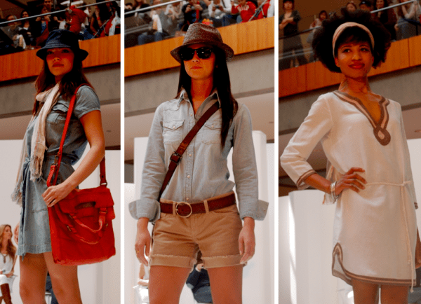 After telling one male model to pull out his tucked shirt, he quips, “see — instant sloppy.” The women’s Havana Tunic Dress makes a repeat runway appearance highlighting two different ways to wear it — first as a beach look with a hair scarf and sky-high wedges, then over white jeans with sandals for a day out shopping.