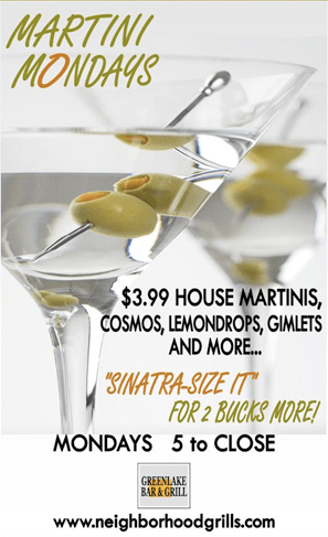 If you fancy a martini, be sure to head over to the Greenlake Bar & Grill on Monday evenings. House martinis, cosmos, lemon drops and other classy cocktails are all offered for less than $4 from 5 p.m. to closing time.