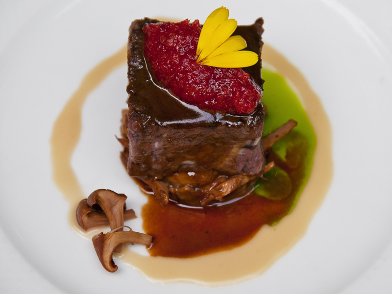 The dish enamors its eaters with its multiple dimensions including the intensity of the jam from harissa, a Tunisian hot chili sauce, the savory creaminess of foie gras, the earth of the mushroom and the robust pork rib.