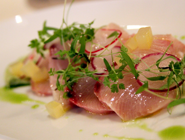 The Dish: Hamachi Crudo ($14) — Plump and oleaginous in goodness, the yellowtail tuna is served cold and raw (as it should be). A scattering of pea vines and sliced radishes rain over the top of the fish with chunks of daikon, stone fruit or avocado below – all depending on what chef has in store that day.