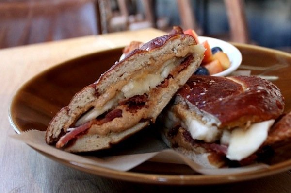 The brunch menu has a variety of offerings and can satisfy your sweet or savory cravings. Start with a spicy Bloody Mary served with a beer back or bubbly Mimosa with grapefruit or orange juice. The Pretzel Knodel is a cross between a bread pudding and French toast with maple glazed bacon on the side. The Elvis Pretzelwich, inspired by Elvis’ favorite sandwich combination with peanut butter, bacon, and bananas is the perfect balance of sweet, savory, soft, and crunchy.