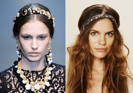 Perch a charming headwrap on the edge of your hairline for a look that’s soft and pretty. Like Oscar de la Renta’s ladylike band (left), this twisted lace wrap will add a touch of whimsy to flowy blouses or fitted cardigans. Wear it with wavy locks or a loose ponytail.