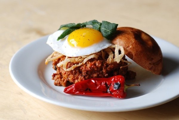 Roasted Bone Marrow with four large marrow bones and grilled, crunchy buttery bread. Scotch Egg — a soft boiled egg with housemade sausage on top of a brussel sprouts and mustard cream. The Wild Boar Sloppy Joe was our favorite — juicy and flavorful ground boar meat with fried onion and sage and a grilled fresno pepper and topped with an (optional) duck egg.