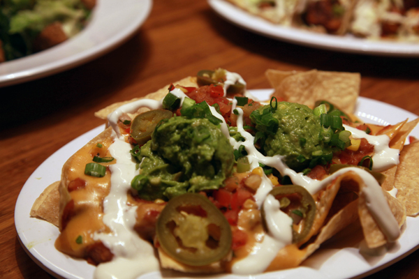 You know how sometimes you go out to eat and you’re really hungry and everyone at the table decides that ordering an appetizer is a good idea. So you order nachos somehow blocking communication from the part of your brain that remembers: nachos are not an appetizer. Nachos are a full meal. For two people. You know how that happens sometimes? Well guess what. It doesn’t happen here, because the nachos appetizer is actually the size of an appetizer. I shared the modest plate with one other person and still had plenty of room for dinner! This is freaking genius you guys. And on top of that, they tasted good! Heavier on the refried beans and sour cream than the cheese, which if your familiar with vegan cheese, is a great thing. And the best part? The guacamole. Nothing special, just really, really ridiculously fresh and flavorful avocados smashed to pieces.