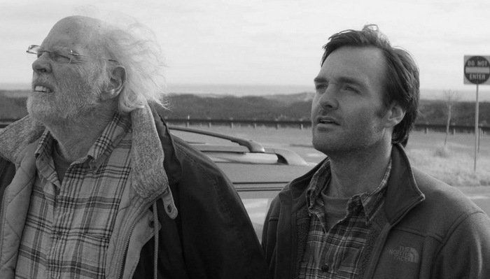 “Nebraska starts with the old school painted mountains of the Paramount logo, a veiled reminder of the golden days of the USA, and jumps into an austere black-and-white landscape of Montana as Bruce Dern’s Woody Grant stumbles down the snowy strip of government manicured grass between some train tracks and a largely vacant highway. Convinced he has won a million dollar prize, Woody’s intent on claiming his winnings in Nebraska even if that means walking the entire eight hundred mile trip on foot. A reminder of how off the tracks his life has veered, Woody sees his not-too-good-to-be-true grand prize as a means to a life he never had – a golden ticket to meaningfulness and utility long lost.”