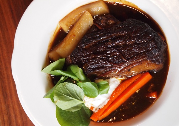 Pastured Skagit River Ranch Wagyu Beef Brisket, Marché’s take on the French country classic, pot au feu is braised overnight in bone broth and served with organic, island-grown carrots and turnips; freshly grated horseradish and wild watercress finish the dish.