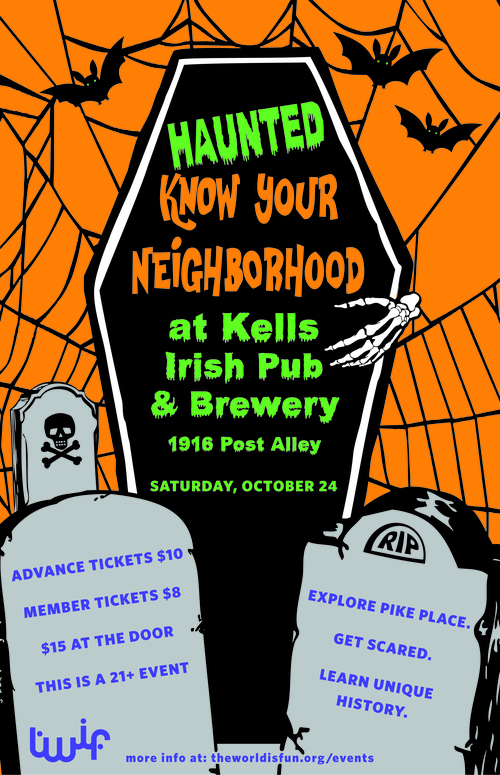 The World Is Fun (TWIF), a local non-profit social and charity club, hosts the Know Your Neighborhood event series that brings Seattle residents to new places each month. For its third installment, TWIF is bringing attendees to Kells and Pike Place Market at night for a social get together of interactive scavenger hunts, puzzle solving, eerie local stories, and chances at great prizes. The once corrupt mortuary that is now Kells and the Indian burial grounds underneath Pike Place Market make the area an enticing adventure for Halloween.