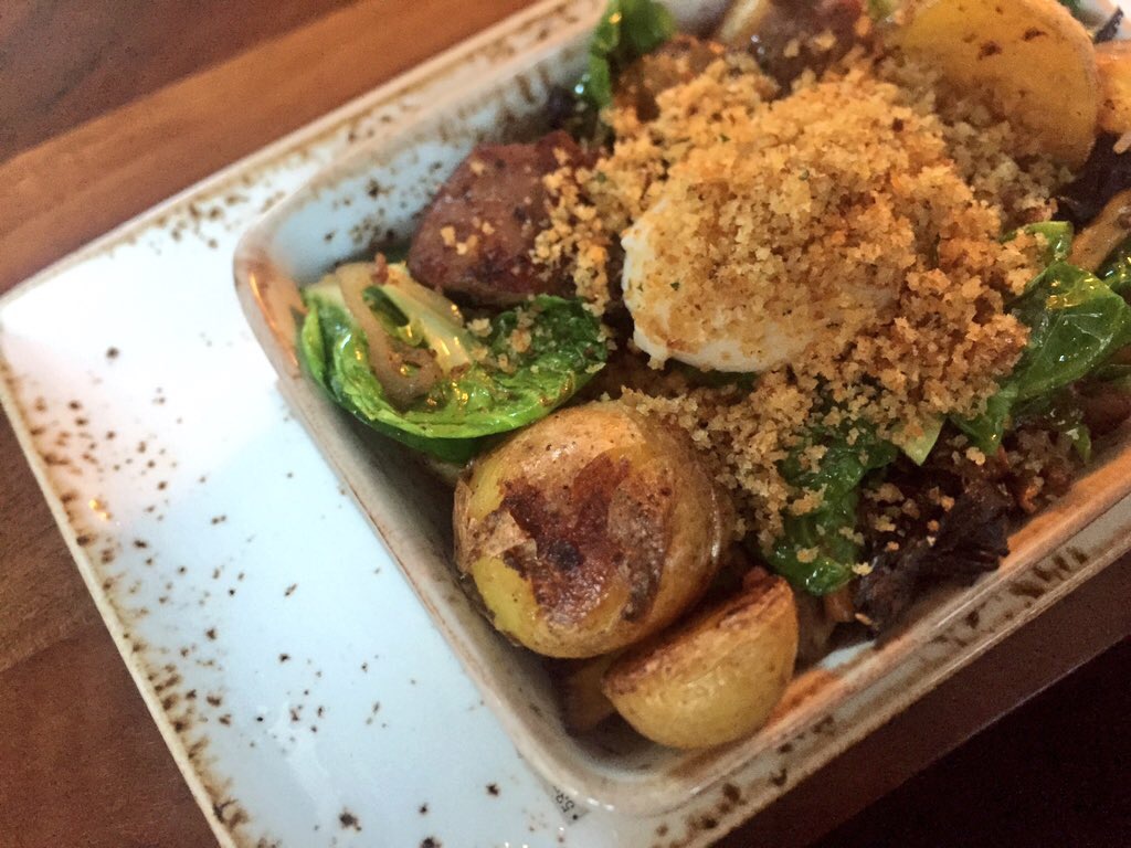 We ordered the Smoked Trout Benedict and the Pork Cheek Hash. The benedict comes with spinach, hollandaise sauce, a grilled baguette, and a fresh salad. They skimped on the hollandaise and the grilled baguette was overly toasted. The hash came with pork cheek, brussels sprout leaves, potatoes, chanterelle mushrooms, and poached eggs. The mushrooms and eggs were perfect, but the potatoes were pretty mediocre—they needed more seasoning and to be cooked longer. The flavorful and oh-so-tender pork cheek was the highlight of the meal.
