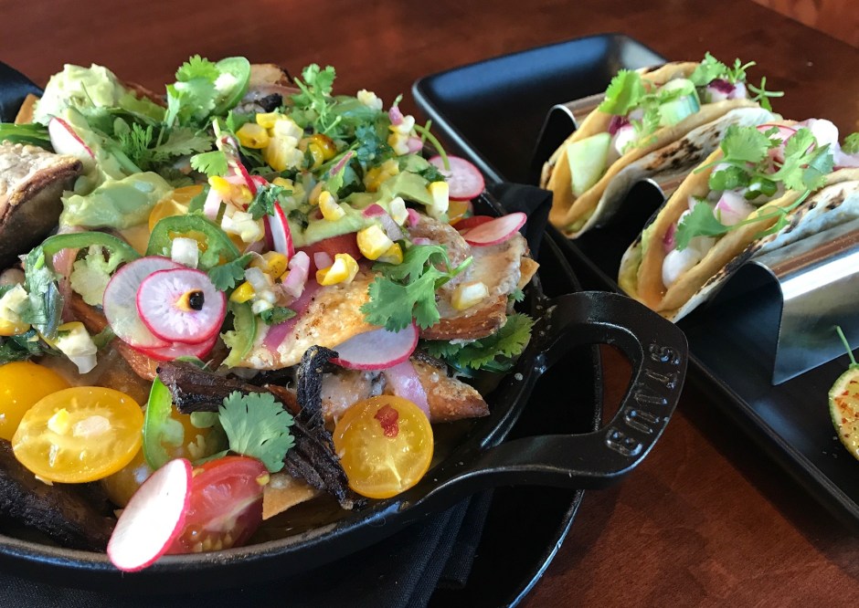 The Empa Nachos are packed with flavor, featuring bright cherry tomatoes, crisp radish slices, mishima reserve beef, and empanadas filled with spicy black beans. If you’re with a group of 4-6, order the Bronto Shank Taco Platter that includes tortillas and all the fixins’ to build-your-own tacos.