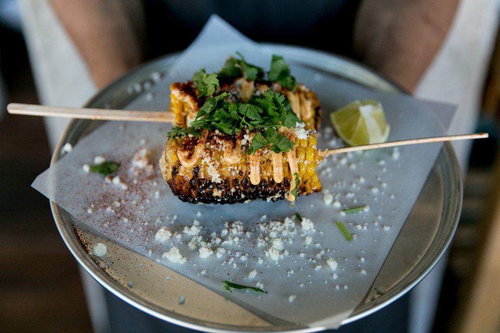 Start with the Grilled Street Corn with cotija cheese, cilantro, and lime served on the cob or Roasted Cauliflower with pepitas, pickled raisins and fresno chilies, and lime crema.