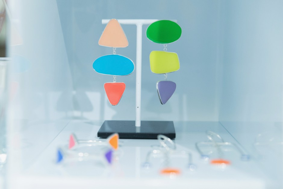 The exhibit has both vintage pieces dating back to the 80s and recent pieces designed by Du Pasquier just last year. Through a partnership with leading Memphis-dealer Keith Johnson, Kim acquired original pieces including chairs, mirrors, lamps, vases and even scarves The collection is characterized by bright candy colors, crazy prints, and bold, geometrical shapes.