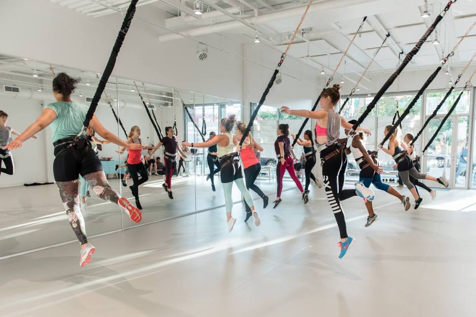 We learned some basics in the 60-minute class, including landing correctly and how to manage the resistance of the bungee cords. Some of the moves in the class are familiar, including planks, pushups, and squats. Some are completely new, like the “chandelier” spin and a run-and-jump-into-the-air move. There’s a little bit of coordination required, but Alexandra demoed everything for us and it was easy to pick it up.