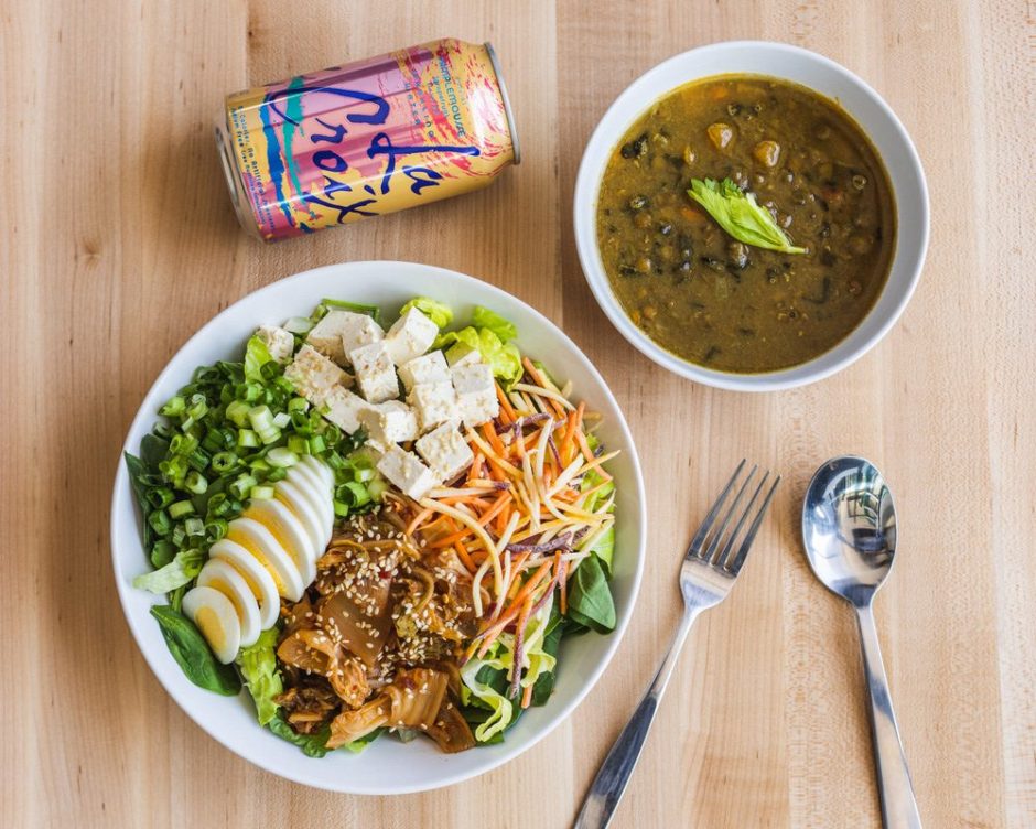Soups are $4 each with choice of garnish from the salad line (i.e., croutons, Parmesan and pesto on the Tomato Basil), and $3 when purchased with a salad, wrap, or grain bowl.