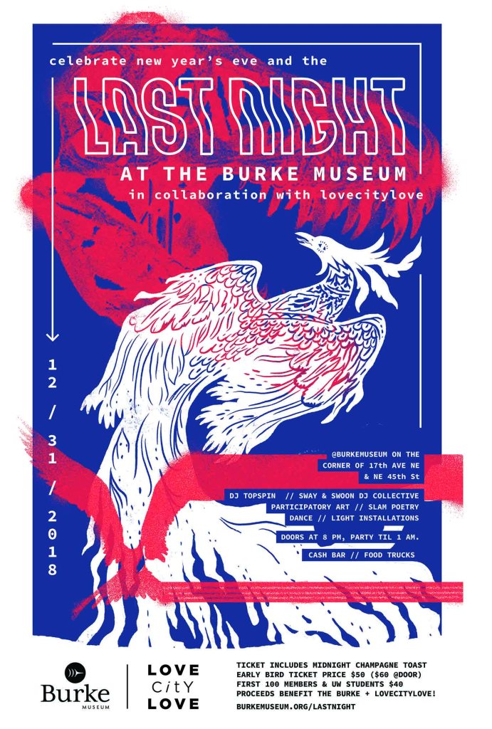 Take flight into 2019 at the Burke Museum’s once-in-a-lifetime New Year’s Eve party in collaboration with LoveCityLove. Come experience eight rooms of movement and sound as over 20 DJs, live bands, dancers, artists, and slam poets come together to celebrate as the Burke takes flight into a new year and a new building. At this one-of-a-kind event, you can share your New Year resolutions and shape the future of the New Burke with Seattle Design Nerds. $50 advanced general, $60 at the door. Buy tickets here.