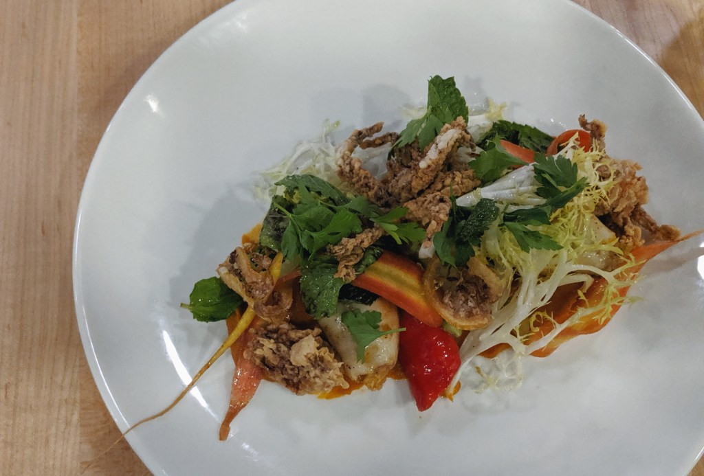 We began with the Seared Calamari with chorizo stuffing, spice carrot purée, fried lemon, and mint. The mint leaves were a well-paired pop of flavor, and the chorizo highlighted the squid, rather than overpowering it.
