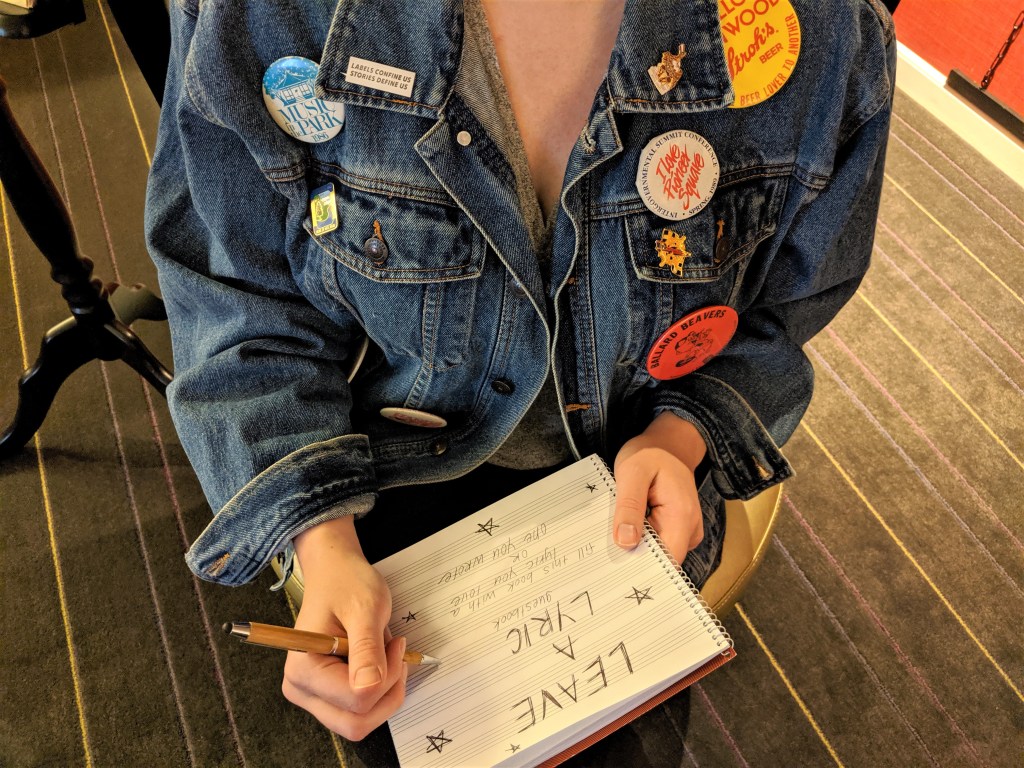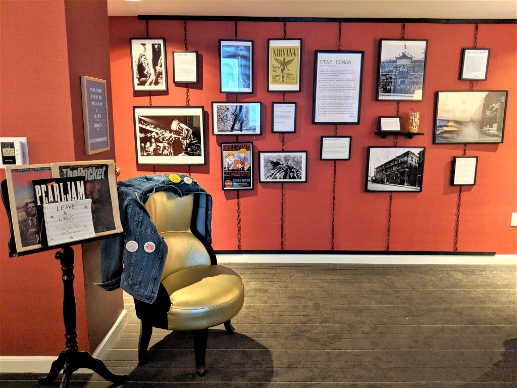 Guests are encouraged to share their experiences with one another through the in-room origami swan installation, as well as the lyric book that is full of favorite lyrics each guest has left during their stay in the room. There is also a vintage denim jacket that is adorned with classic, Seattle-only buttons and patches that guests are invited to wear and contribute to while they venture around Seattle.