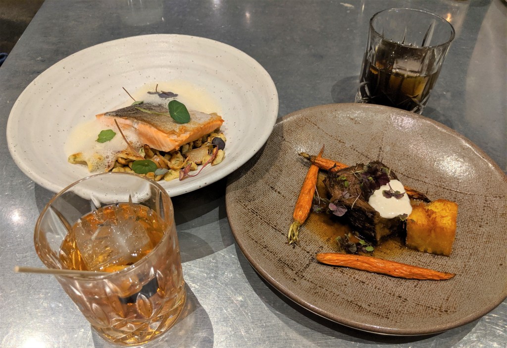 After exploring the room, we went downstairs to enjoy dinner at the Outlier. We loved being able to enjoy a delicious meal and cocktails just downstairs from our room. I ordered the Seared King Salmon with