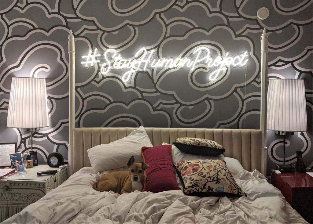 We felt like VIPs as soon as we entered Hotel Monaco, with the front desk inviting us down to the living room for wine hour, and displaying our dog Archie’s name on a VIP guest board for the weekend. The hotel experience can often feel cold and disconnected, and we deeply appreciated the welcoming staff at Hotel Monaco and the excitement they built around our stay in the #StayHumanProject room.
