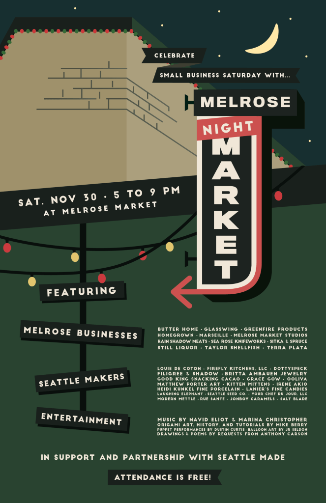On November 30th, Small Business Saturday, the Melrose Market Studios space will be transformed into a holiday bazaar with 20 local artisan vendors curated by Seattle Made. From 5:00 pm to 9:00 pm, shoppers can visit their favorite Melrose shops and restaurants as well as browse the bazaar and cross everyone off of their holiday gift list while supporting independent Seattle businesses!