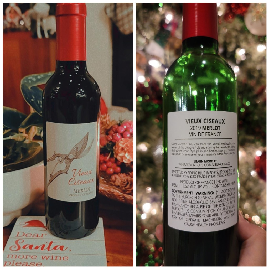 Day 1: Vieux Diseaux 2019 Merlot—I enjoyed this one. It was medium bodied and luckily not fruity at all.