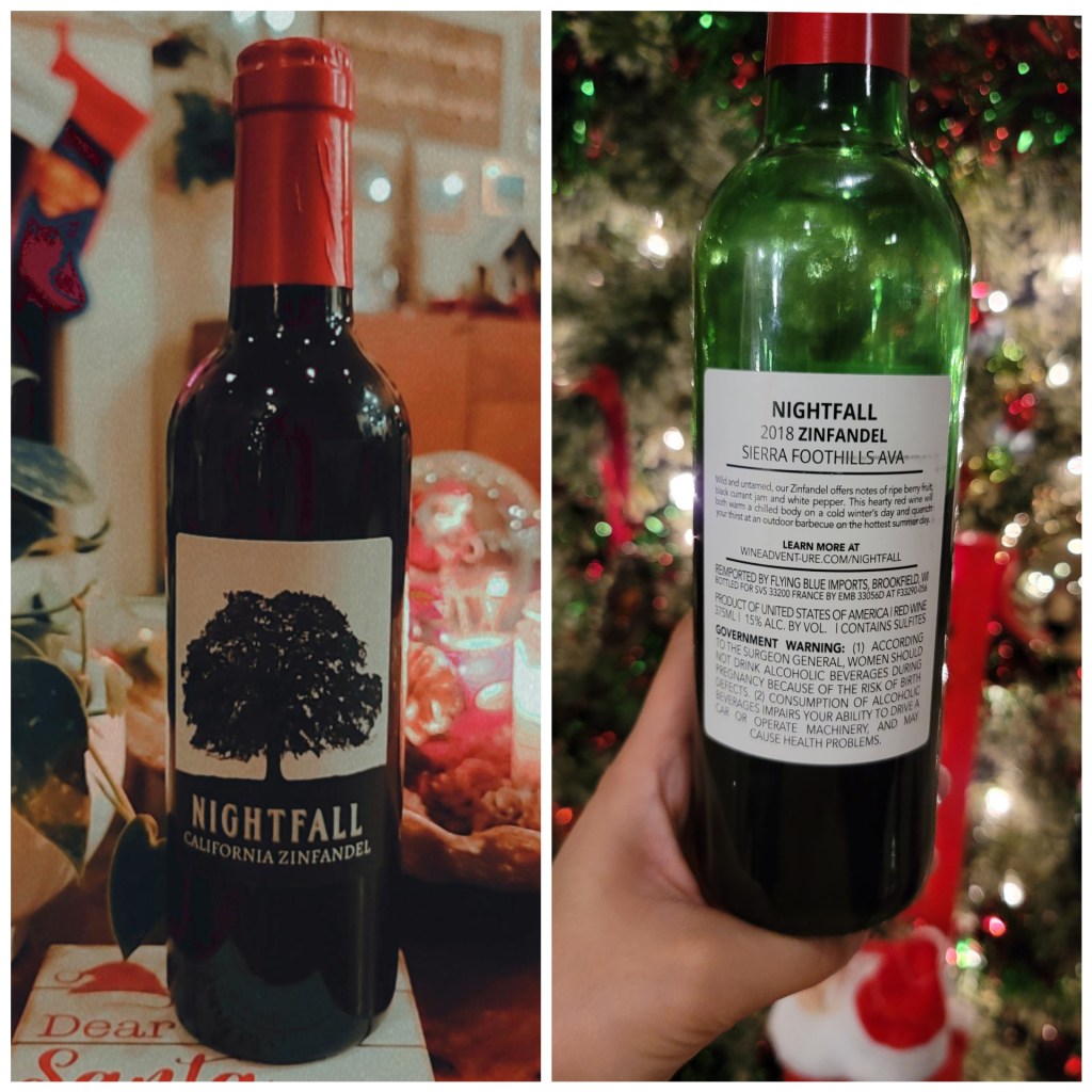 Day 2: Nightfall 2018 Zinfandel—I forget that red Zinfadel’s exist because I try and block out Zinfadel’s entirely. It was a light red and on the sweeter side. You could smell the tannins when you uncorked the bottle.