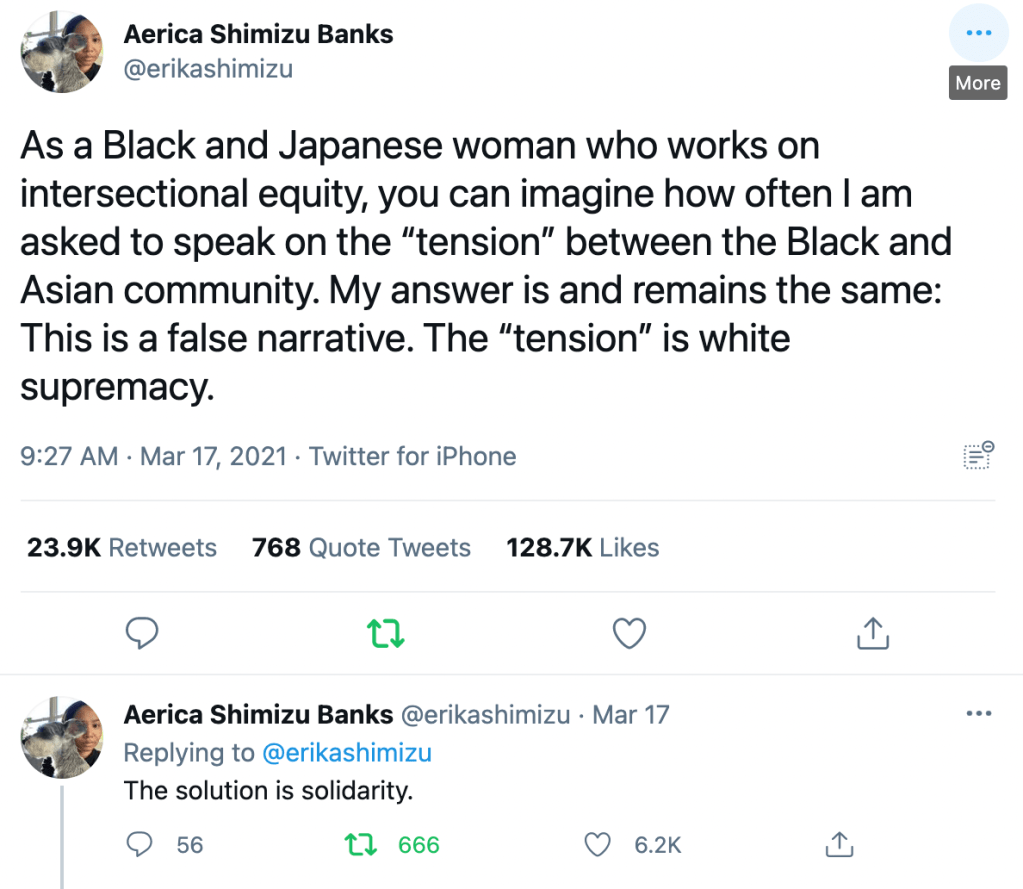 While we should absolutely take the time we need, it is crucial to remember that intersectionality is imperative in our efforts towards racial and social equity. Asian Americans need to stand in solidarity with Black people. Though our history is fraught, the “tension” as Aerica Shimizu Banks puts it, is white supremacy.