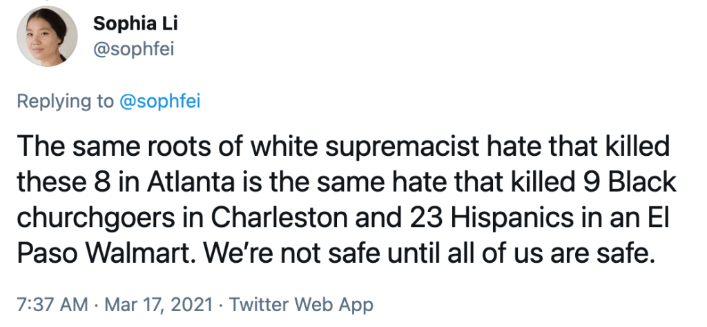 To my fellow Asian Americans, I hope you’re doing okay. I see you and I’m with you. Please take care of yourselves and exercise self-compassion in processing what happened this week and in the past year. Not to mention the memories it likely activated in you of other instances of microaggressions and racist experiences. We all have a version of these stories. I remember being told how good my English is (because I was born here), being asked where I am really from (here!), being told to go back to “where you came from” (again, I’m from here), and being asked if I can see when I smile. I can recall instances of being scolded by white women in public spaces—as recently as last year—maybe because I appear younger than I actually am (little did she know I would raise my voice and cuss at her), and of course, being fetishized by white men.