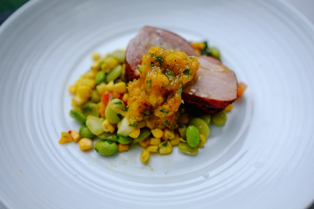 The thoughtful curation of ingredients and flavors was present in every part of the meal. The first course was a dill latke with olive oil poached albacore and trout roe. Next up was a delightfully fresh burrata dish with farm greens (which according to Chef Neeley were grown on Vashon Island), smoked cherries, and Rainier cherry vinaigrette. The third and main course of the evening was a Juniper-brined, perfectly smoked pork tenderloin, served with summer succotash and an apricot-sweet onion compote. And finally, for the fourth course we had strawberry shortcake with anise drop biscuits and a basil whip.