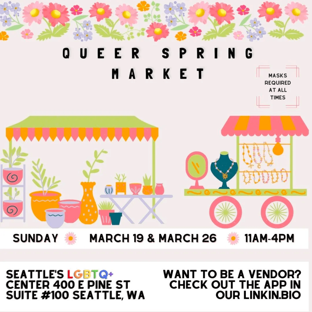 Support 25+ local QTBIPOC artists this Sunday, March 19th. If you aren’t able to make it this Sunday, you’ll have another chance on Sunday, March 26th! Their second ever seasonal market hosted by Gay City, Seattle’s LGBTQ Center. Local BIPOC vendors and makers will be selling their art, pottery, jewelry, vintage clothing, and more.