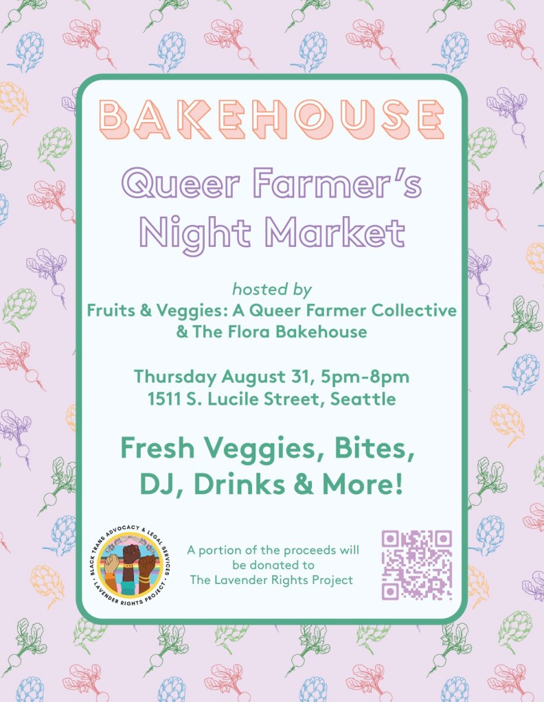 The Flora Bakehouse in Beacon Hill is collaborating with the Fruits & Veggies: A Queer Farmer Collective on August 31 for the first annual Queer Farmer’s Night Market! It will be held Thursday, August 31st from 5:00 – 8:00 pm.