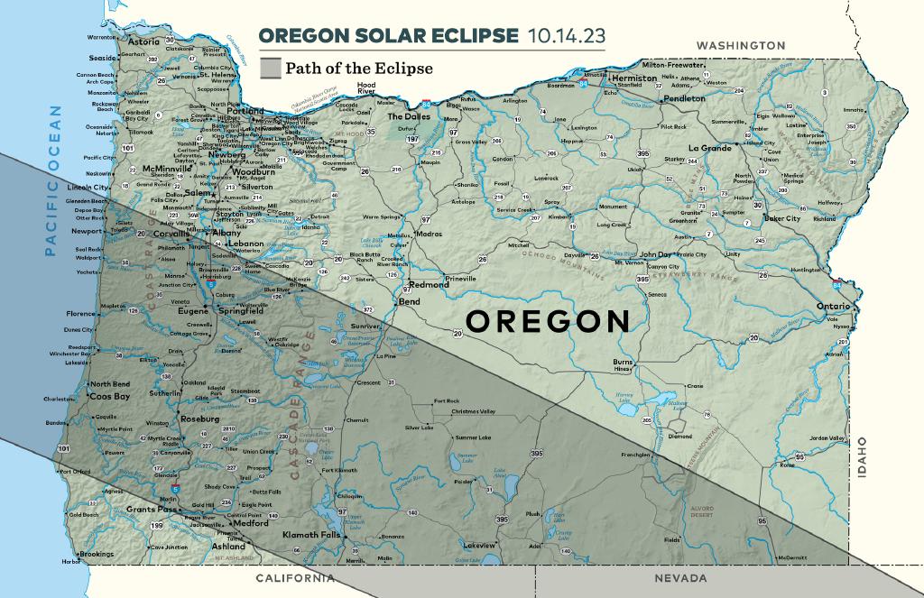 Several regions in Oregon will provide excellent viewing opportunities for a spectacular celestial event this fall: the upcoming annular solar eclipse on Saturday, October 14th. The moon, at its furthest point from Earth, will appear smaller as it passes in front of the sun, creating a brilliant “ring of fire” effect. Visitors are encouraged to book their accommodations and other arrangements as soon as possible — as hotels and campsite reservations are anticipated to sell out quickly — and to anticipate traffic impacts in the path of annularity.