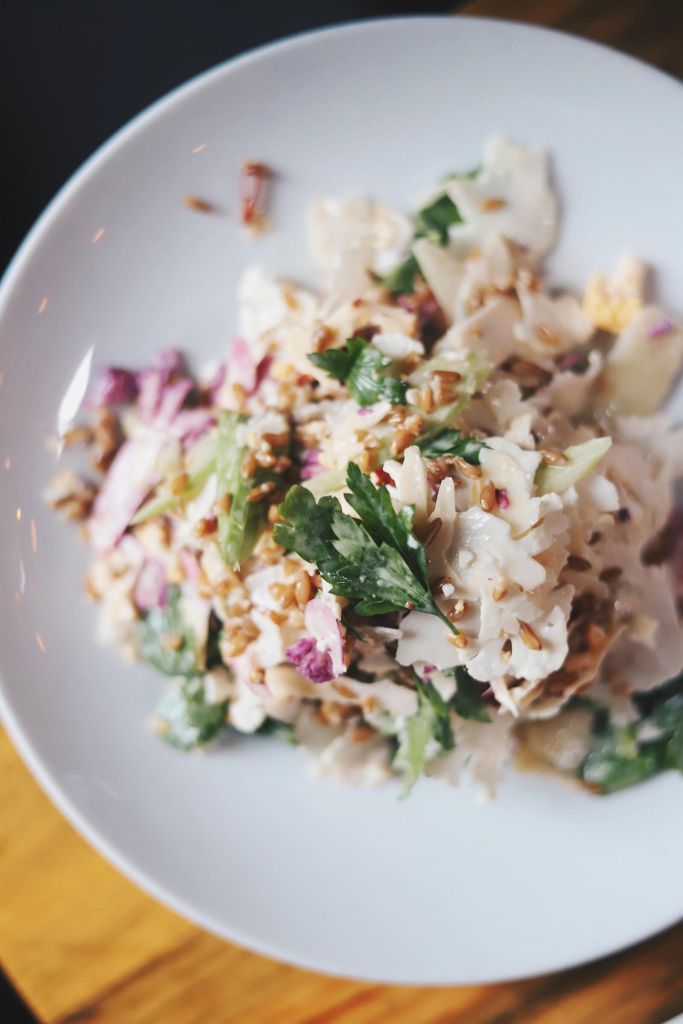 —Heirloom Cauliflower with farro, pine nuts, calabrian chili, celery, white balsamic, and pecorino