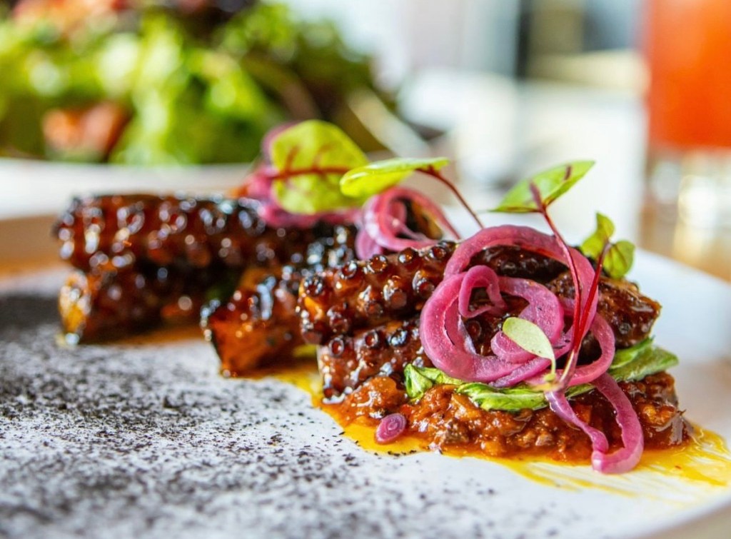 Menu highlights include the charred octopus with a tamarind Korean bbq glaze, the seared scallops with mole verde, and the whole fried branzino with miso caesar salad and crispy capers. Shaker + Spear offers a well-curated wine list that complements its seafood-forward menu, and a fantastic selection of craft cocktails.