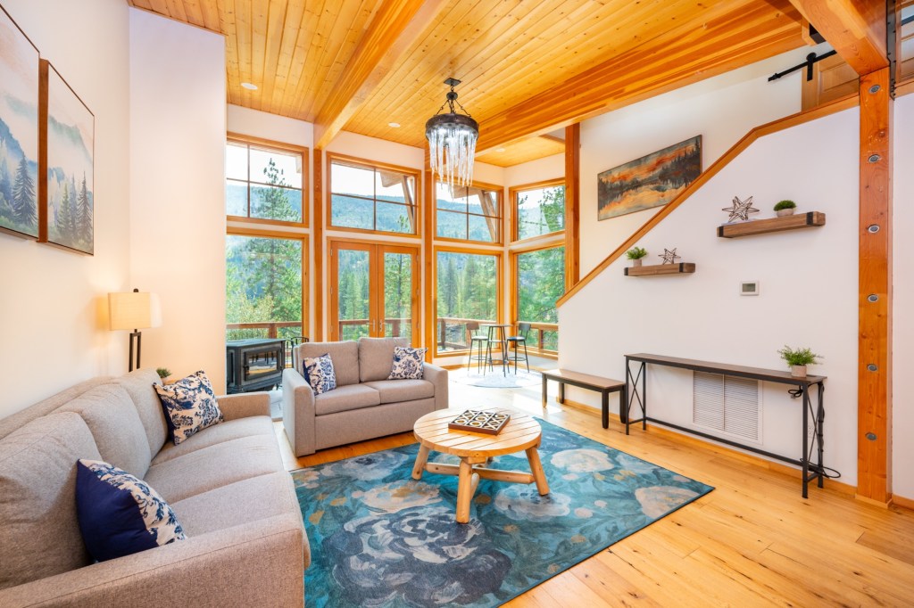 This stunning home is perched above Icicle Creek in Leavenworth with unobstructed views of the Cascade Mountains from every room. Whether you’re sipping coffee on the wraparound deck, lounging in the spacious living room, or cozying up in one of the bedrooms, the beautiful scenery surrounds you.