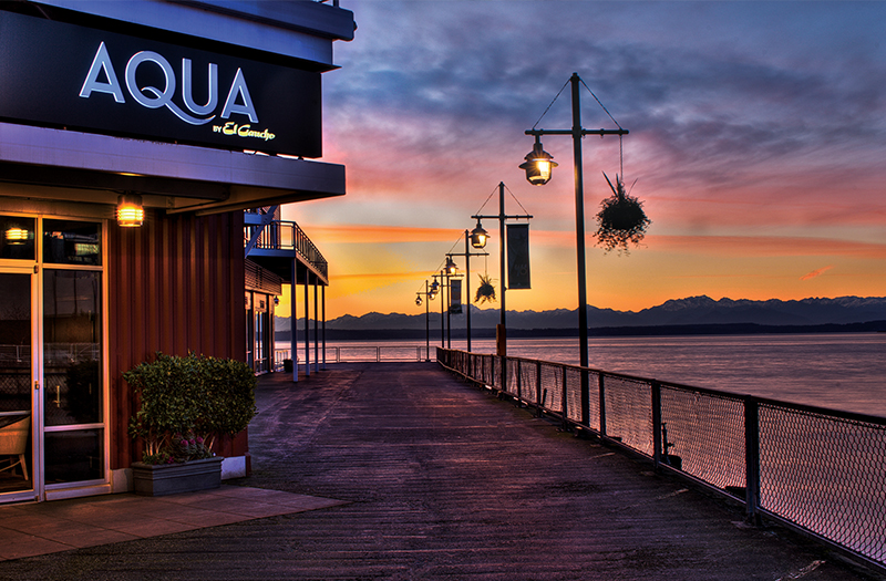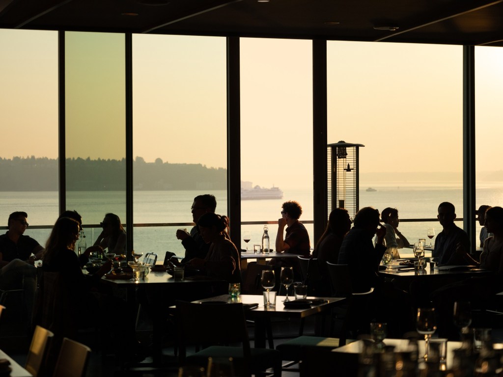 Situated above the waterfront near Pike Place Market, Aerlume offers one of the most stunning patio views in the city. The outdoor seating overlooks Elliott Bay and has views of the Olympic Mountains and the Great Wheel, giving it a dramatic and quintessential Seattle backdrop. The patio is sleek and modern, making it a great spot for date nights, special occasions, or out-of-town visitors. The service is impeccable, making every visit feel special. Aerlume’s menu highlights Pacific Northwest ingredients with dishes like Dungeness crab, smoked lamb carbonara, and beautifully plated seafood, while the bar program features inventive craft cocktails and a well-curated wine list. Come here for refined cuisine paired with some of the best sunset views in Seattle.