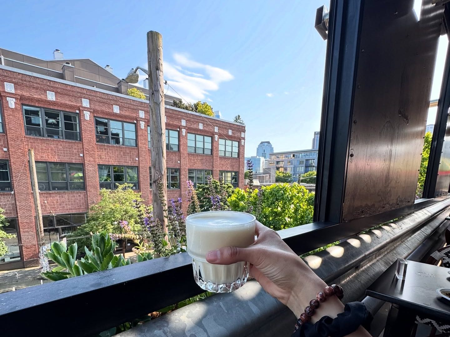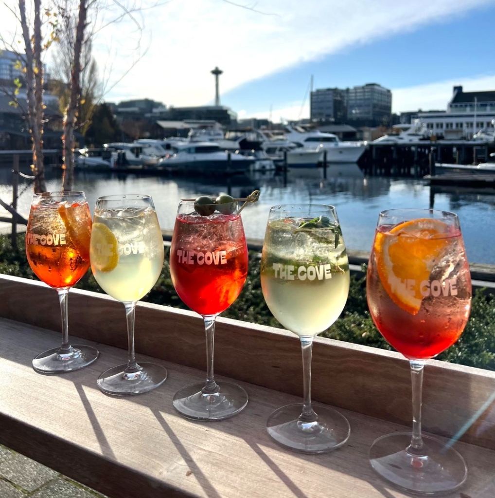 This wine bar that’s tucked away in Chandler’s Cove on Lake Union feels like a hidden gem. The patio sits right on the water, and you can come by boat and dock outside. The Cove is a relaxed spot that’s ideal for drinking rosé, sharing small plates, and watching boats pass. The wine list spans old-world and new-world selections, with plenty of crisp whites and refreshing rosés ideal for warm weather, alongside a rotating selection of beers. Pair your drinks with light bites like charcuterie, cheese boards, and seasonal small plates. The atmosphere is laid-back and summery, making it an ideal place for a slow afternoon or sunset wine with friends. The waterfront patio and dockside setting make it one of the most unique outdoor drinking spots in the city.