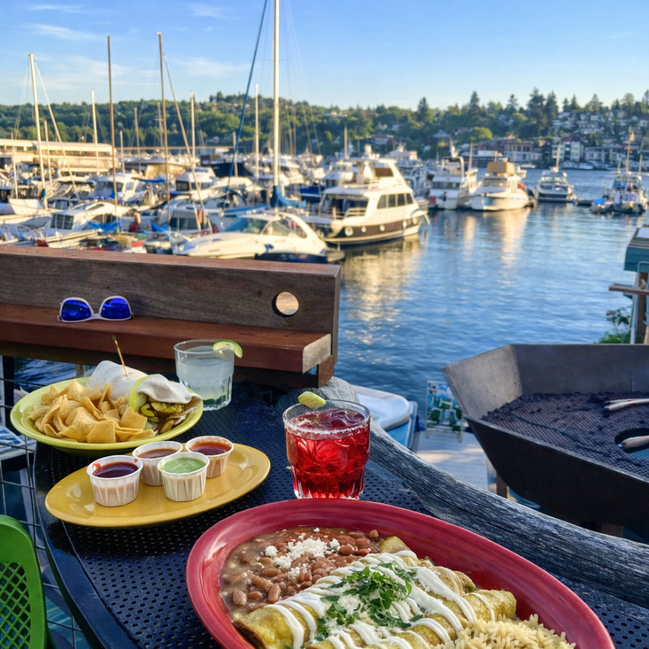 We’ve been going to Agua Verde for more than 15 years, and it remains one of the liveliest restaurant patios in Seattle. Located on Portage Bay near the University of Washington, this colorful Mexican café has a large patio right on the water. Kayakers paddle by while you eat tacos, sip margaritas, and soak up the sun. The vibe here is casual and fun and is superb for daytime dining, brunch, or a sunny afternoon cocktail. The menu features crowd-pleasers like enchiladas, fish tacos, and burritos, along with strong margaritas and refreshing aguas frescas. The bright colors, waterfront views, and laid-back energy make it one of Seattle’s most joyful warm-weather patios.